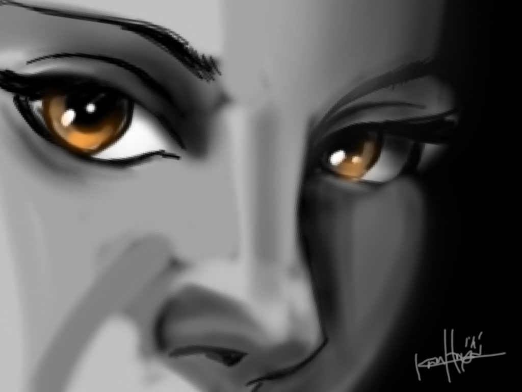 These is something really nice about this - The half obscured eye was mainly out of laziness - didn't want to ensure symmetry of the eyes, but this really adds something. Tools: iPad, Sketchbook pro, finger!
